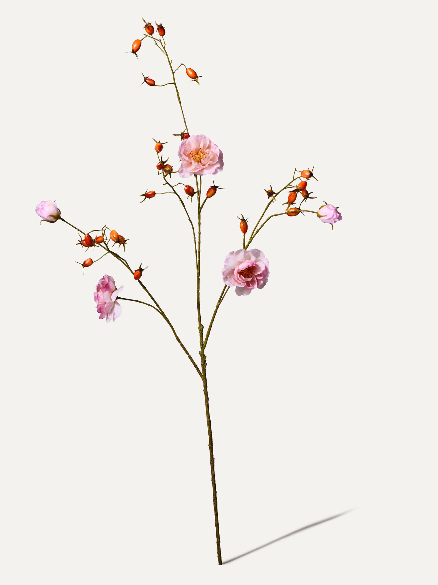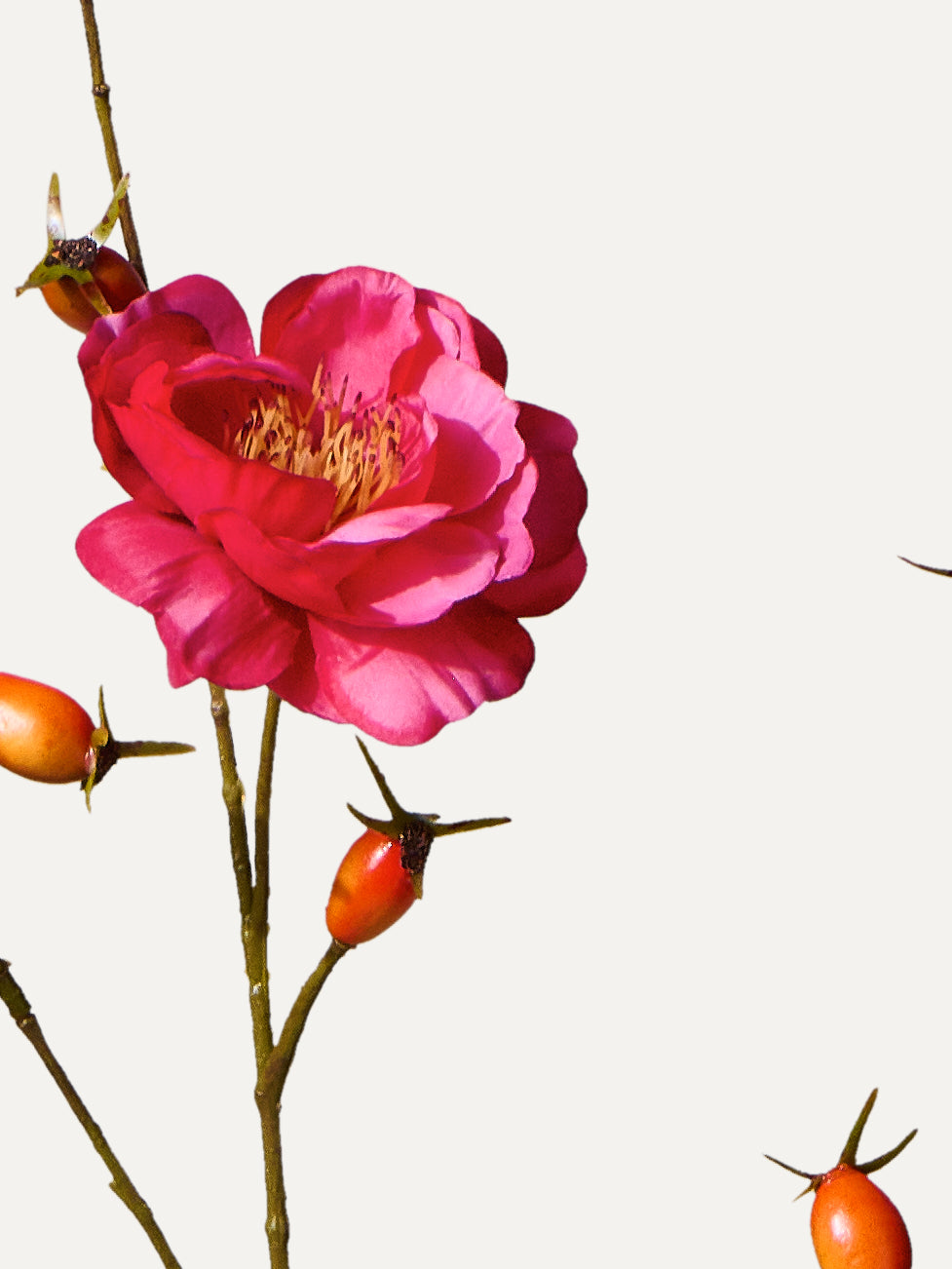Rosehip with berries and rose petals, a detailed artificial flower branch made of Silk-ka quality, measuring 106 cm in length. It adds autumnal warmth and natural texture to any artificial flower bouquet.
