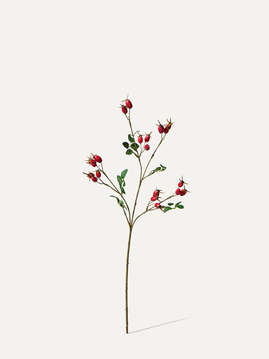 Rosehip branch, a high-quality artificial branch in Silk-ka quality with delicate twigs and intricately crafted berries in warm red. At 67 cm long, it brings autumnal fullness and natural color intensity to any bouquet.