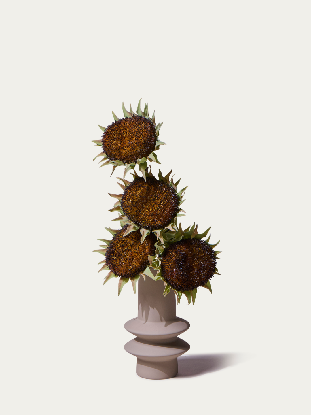 A work of art unlike any other: sunflowers in their late, almost mystical beauty. This bouquet plays with texture, form, and depth—raw, pure, iconic. For spaces with character and people with a sense of style.