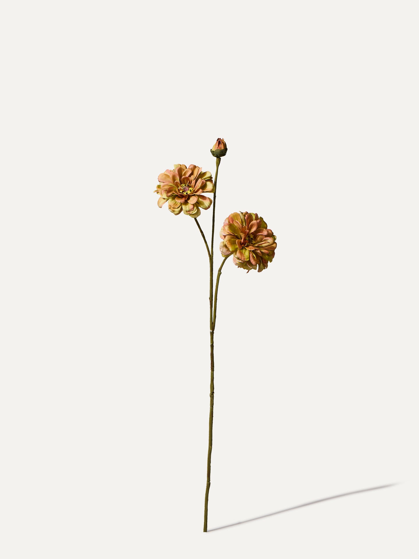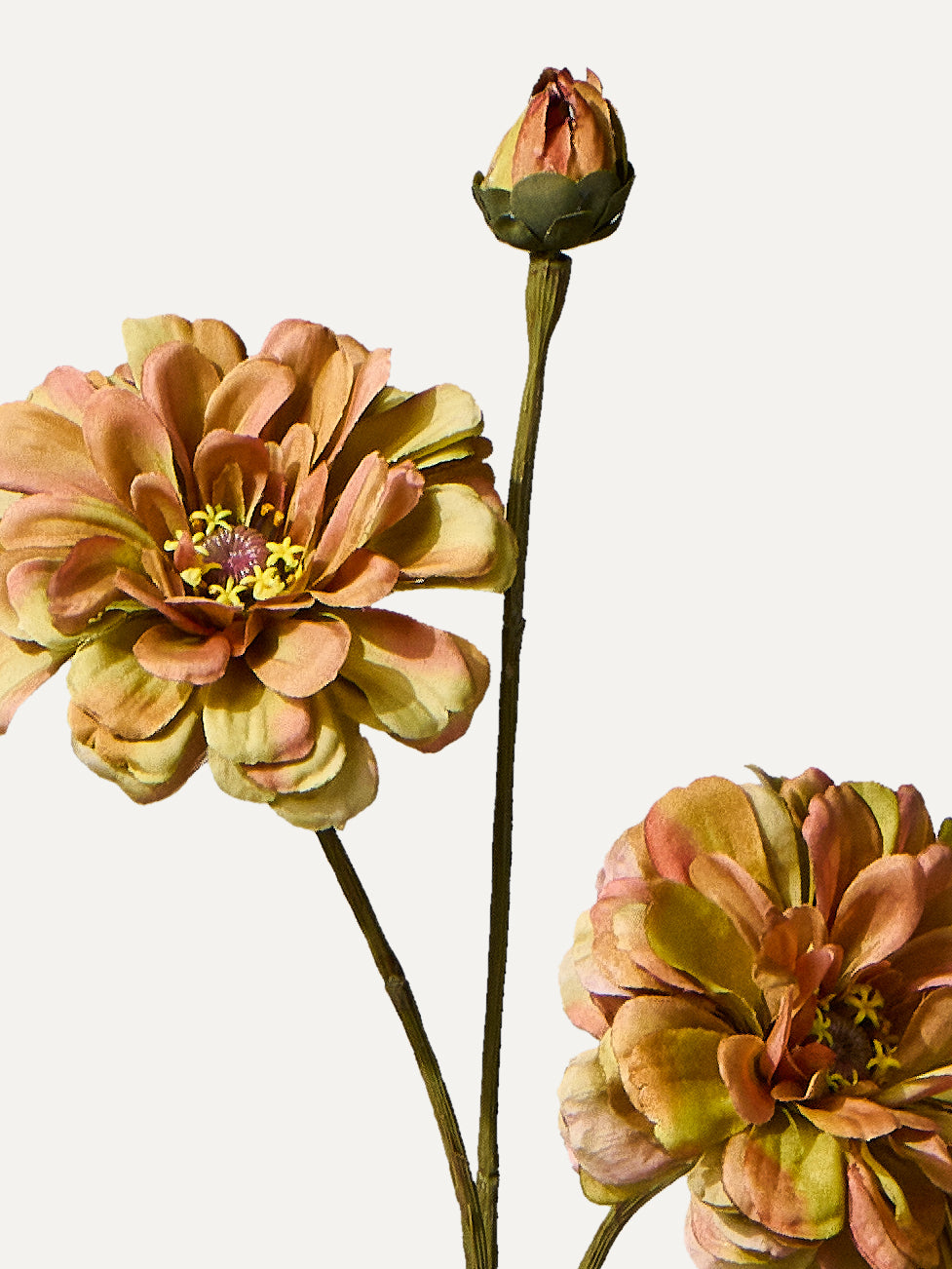 Zinnia, a detailed artificial flower stem in Silk-ka quality with two blossoms and a bud, measuring 66 cm long, adds cheerful color and a playful lightness to any bouquet.