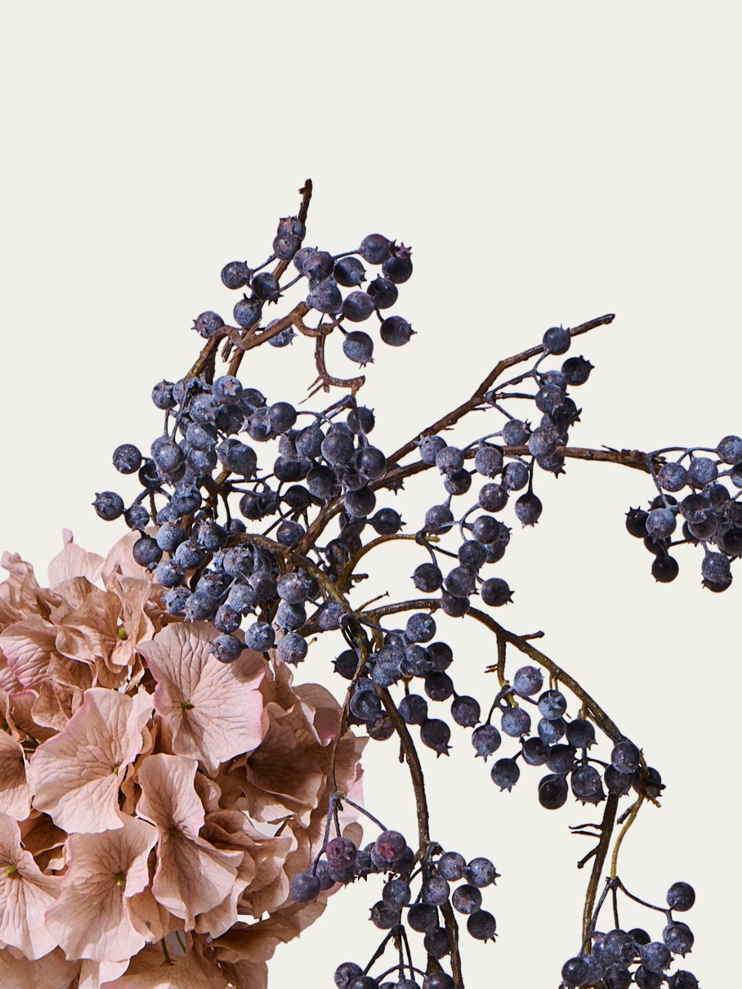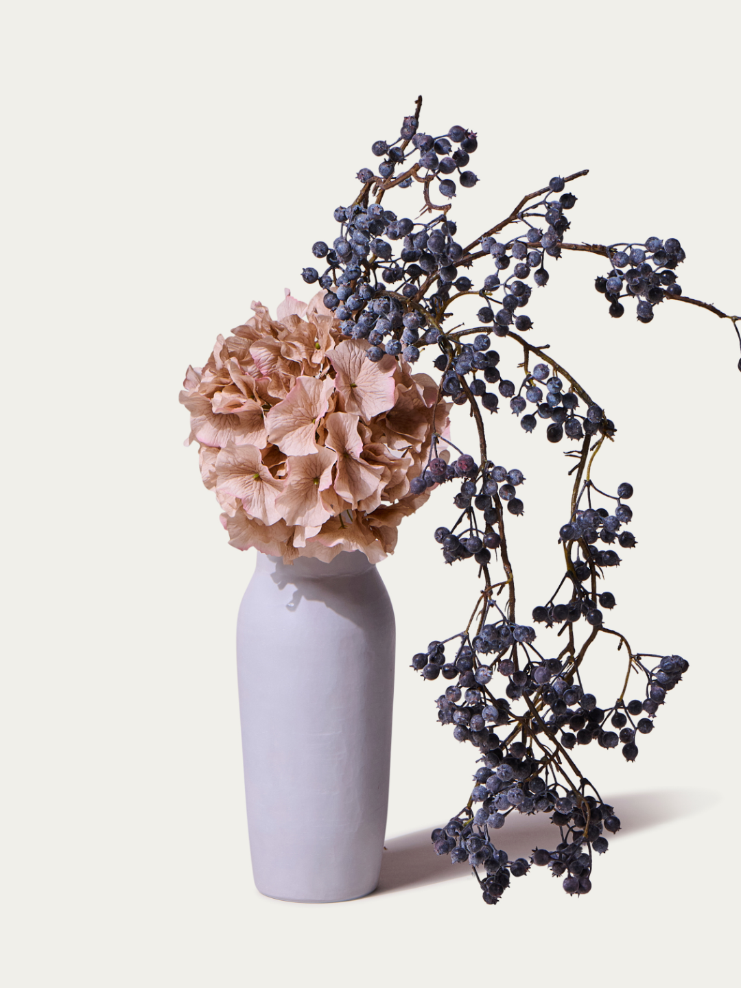 Cet extraordinaire bouquet de fleurs artificielles joue sur les contrastes : une délicate hortensia d’un côté, une vigne à baies sculpturale de l’autre. Ensemble, elles créent une composition florale affirmée, idéale pour les personnes ayant du style et un goût pour l’insolite.
