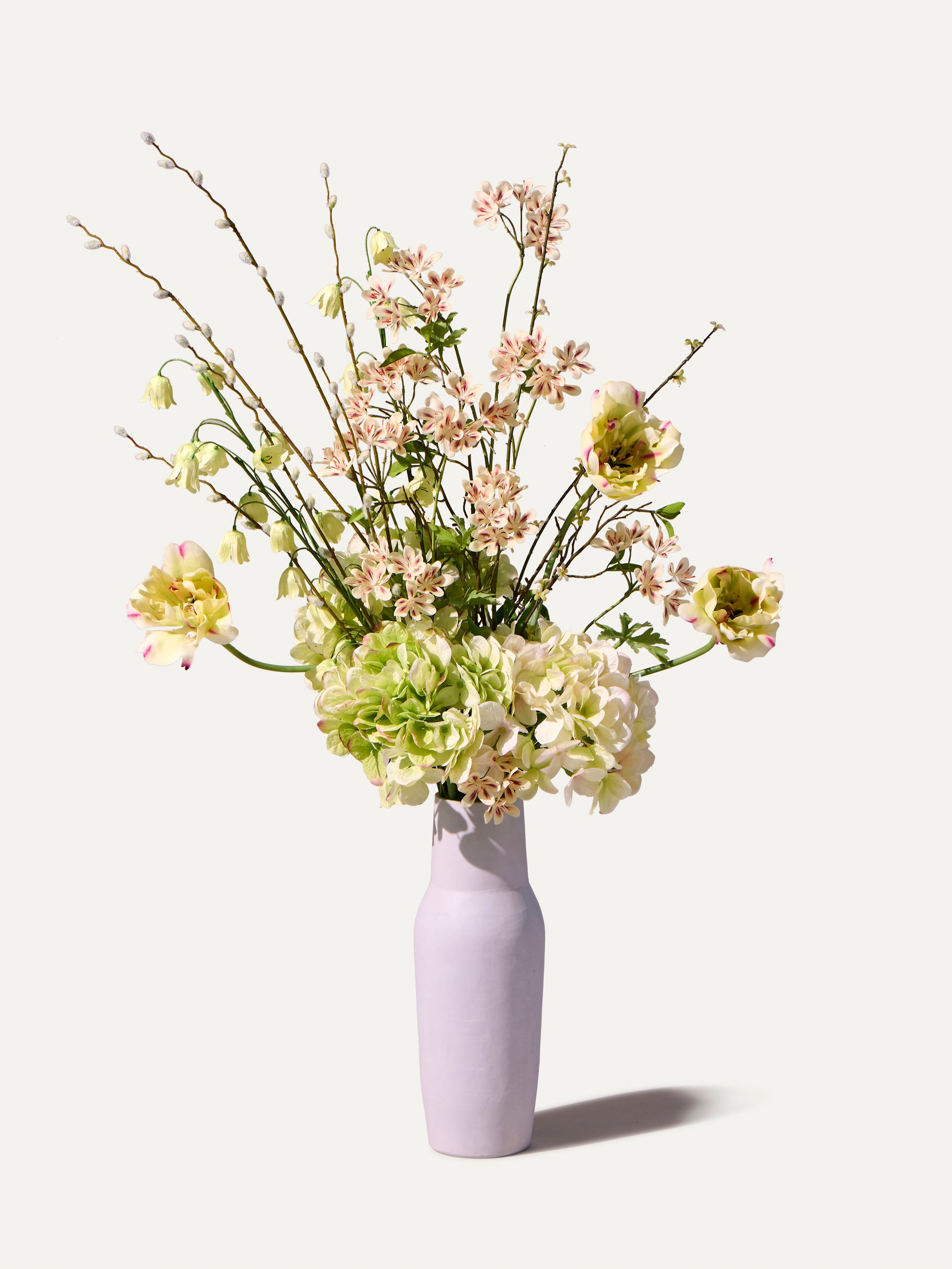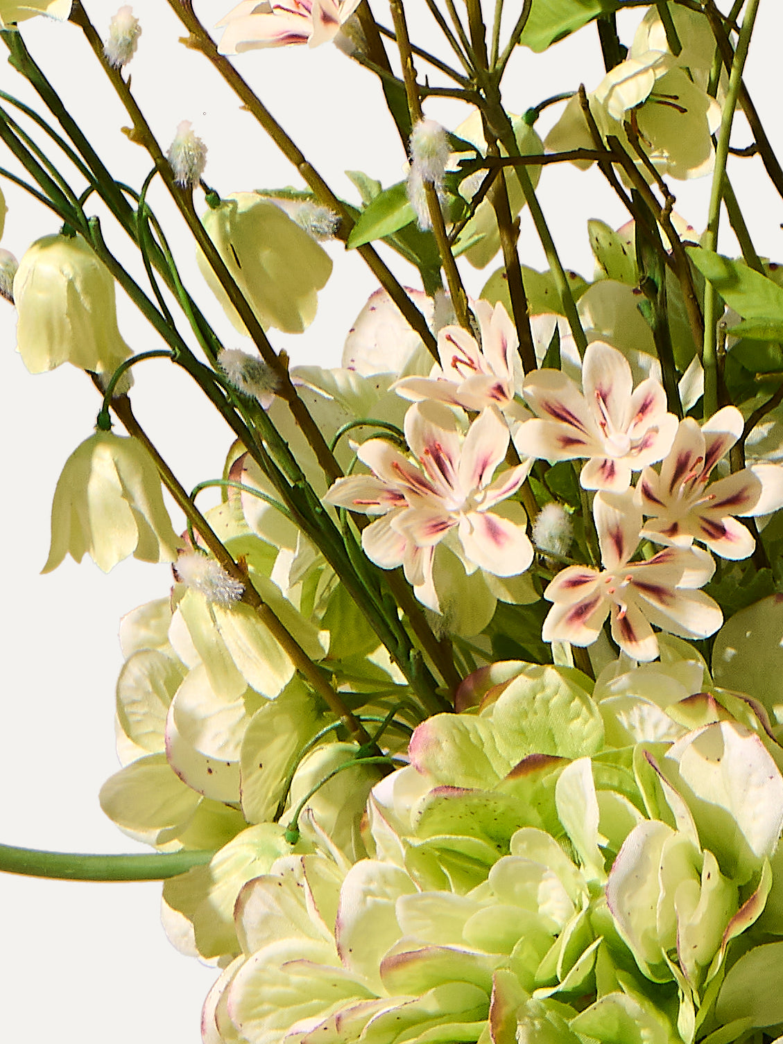 Zarte Hortensien, elegante Tulpen, verspielte Schachblumen – The Schmetterling ist ein Kunstblumen-Bouquet voller Leichtigkeit und Charme. Geranien in sanftem Rosa, geschwungene Weidenzweige und feines Blattgrün bringen Bewegung und Tiefe ins Design. Ein floraler Flirt mit dem Frühling – leichtfüssig, verspielt und zum Verlieben schön.