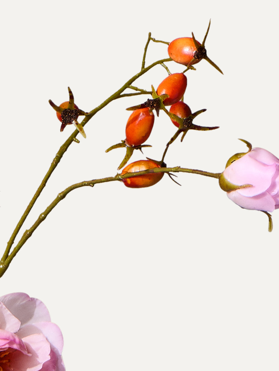 Hagebutte mit Beeren und Rosenblüten, ein detailreich gestalteter Kunstblumenzweig in Silk-ka Qualität mit 106 cm Länge. Er verleiht jedem Kunstblumen Bouquet herbstliche Wärme und natürliche Struktur.