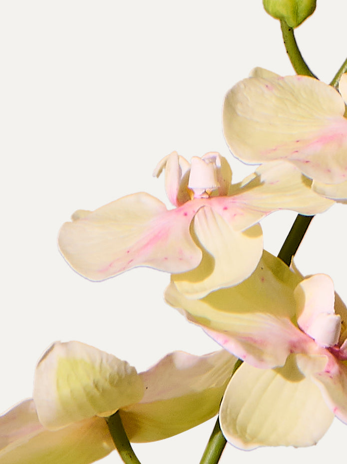 Leise, luxuriös, stilvoll. Dieser zartgrüne Phalaenopsis-Zweig bringt Ruhe und Raffinesse in dein Zuhause, solo oder als Teil deines Kunstblumen Bouquets.