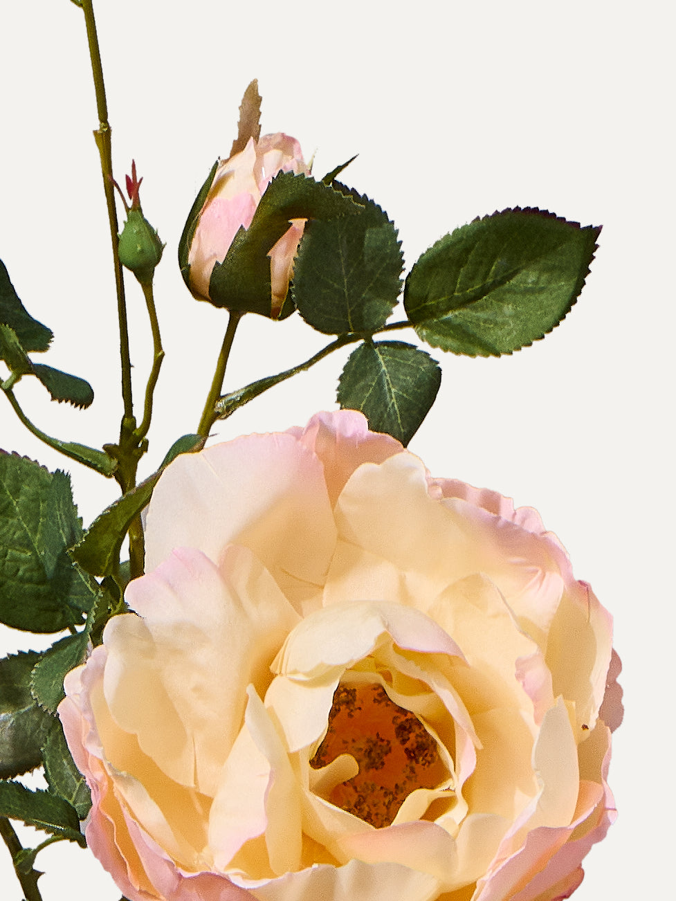 Rosenzweig, ein edel verarbeiteter Kunstblumenzweig in Silk-ka Qualität mit 80 cm Länge. Er bringt romantische Eleganz und verleiht jedem Kunstblumen Bouquet natürliche Fülle.
