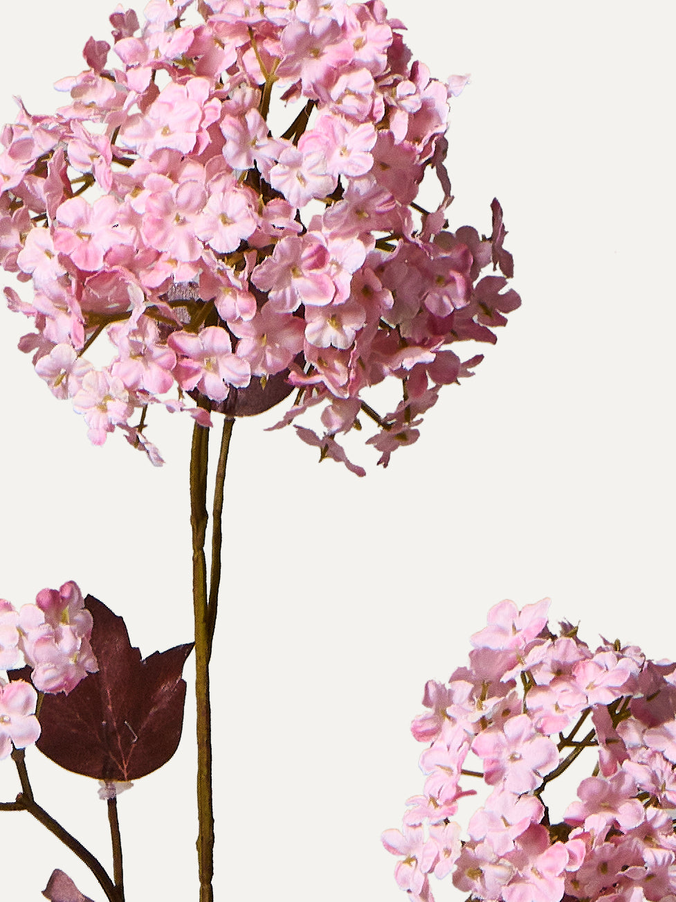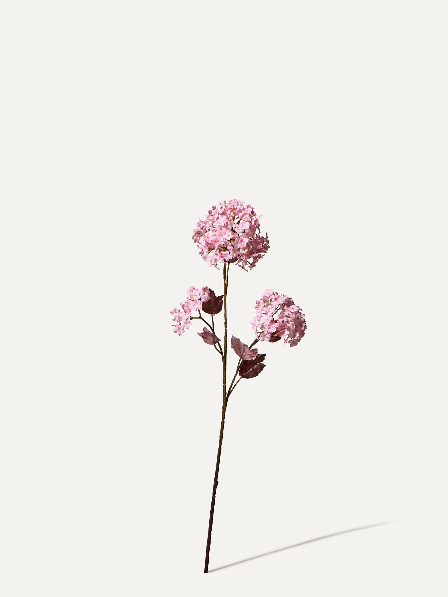 Schneeball in Pink, ein hochwertiger Kunstblumenzweig in Silk-ka Qualität mit 69 cm Länge. Er bringt weiche Fülle und eine zarte Farbnote in jedes Bouquet.