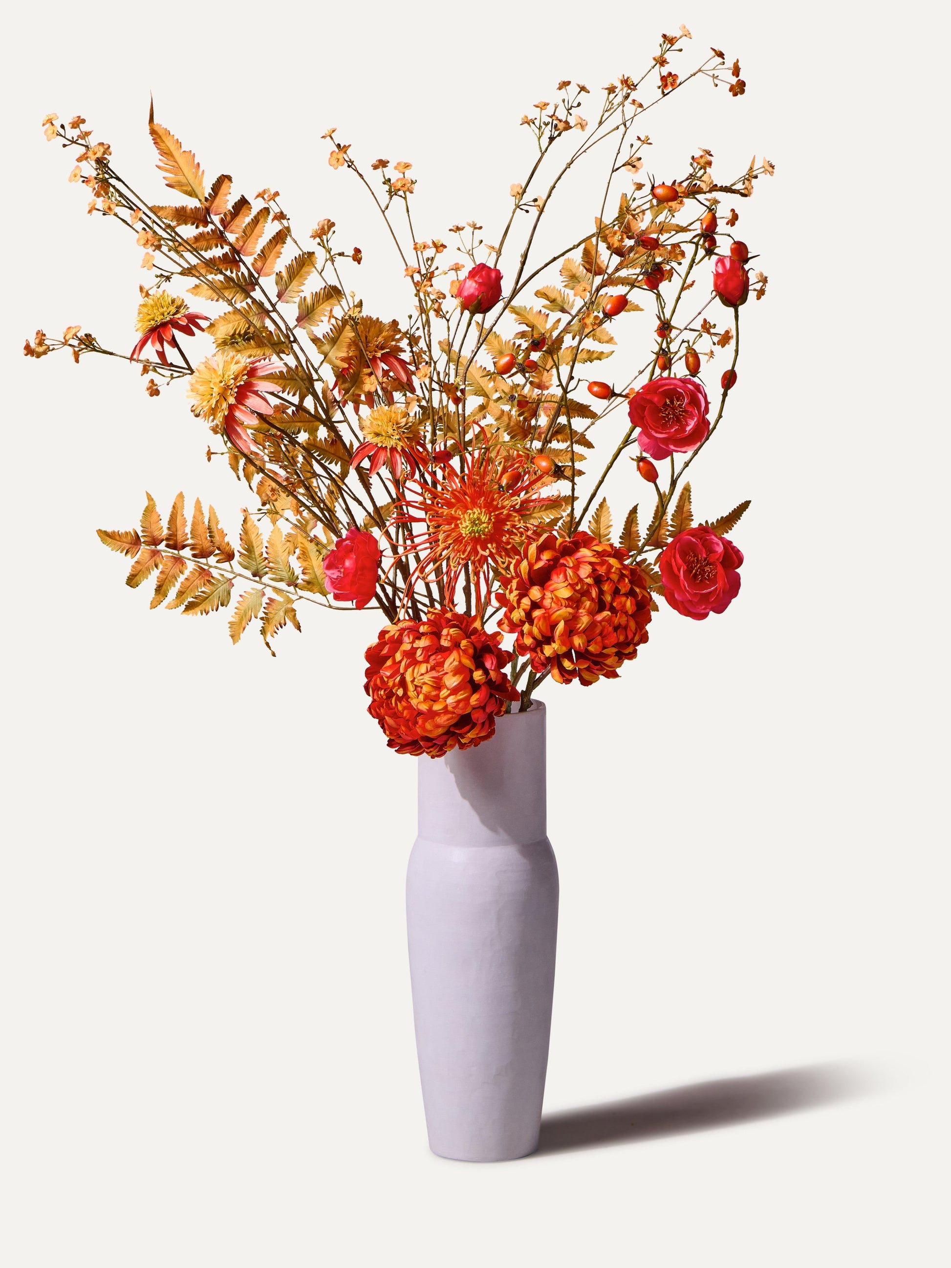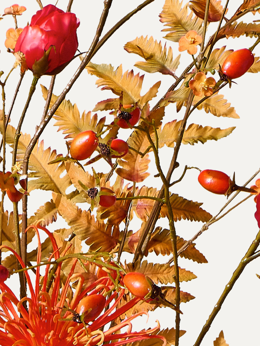 Tiefe Orange- und Rottöne bringen herbstliche Wärme ins Zuhause. Mit grossen Chrysanthemen, feinen Farnzweigen und zarten Hagebutten entfaltet dieses Kunstblumen Bouquet eine stimmungsvolle Präsenz, die dem Wohnzimmer Tiefe und Behaglichkeit verleiht.