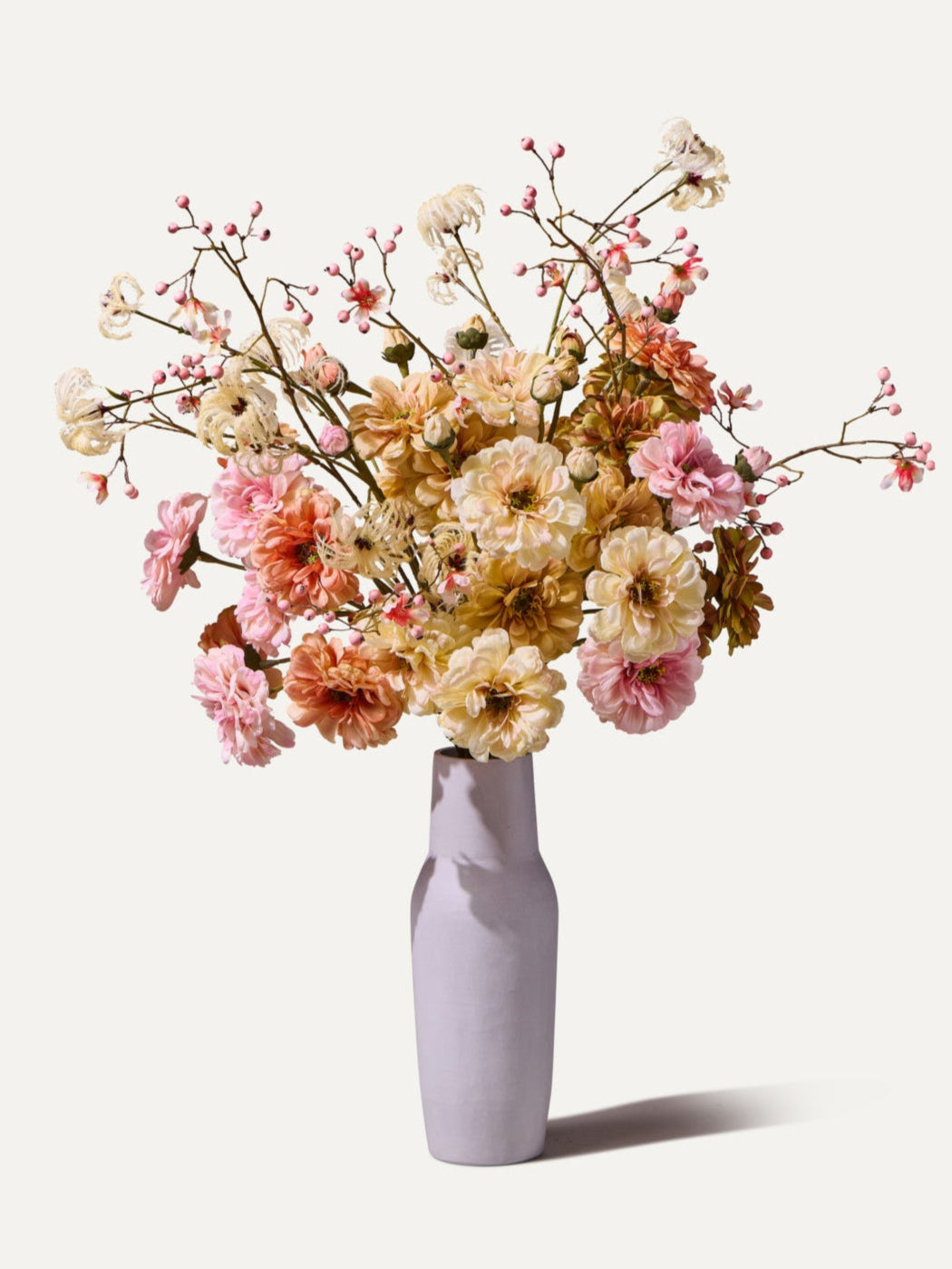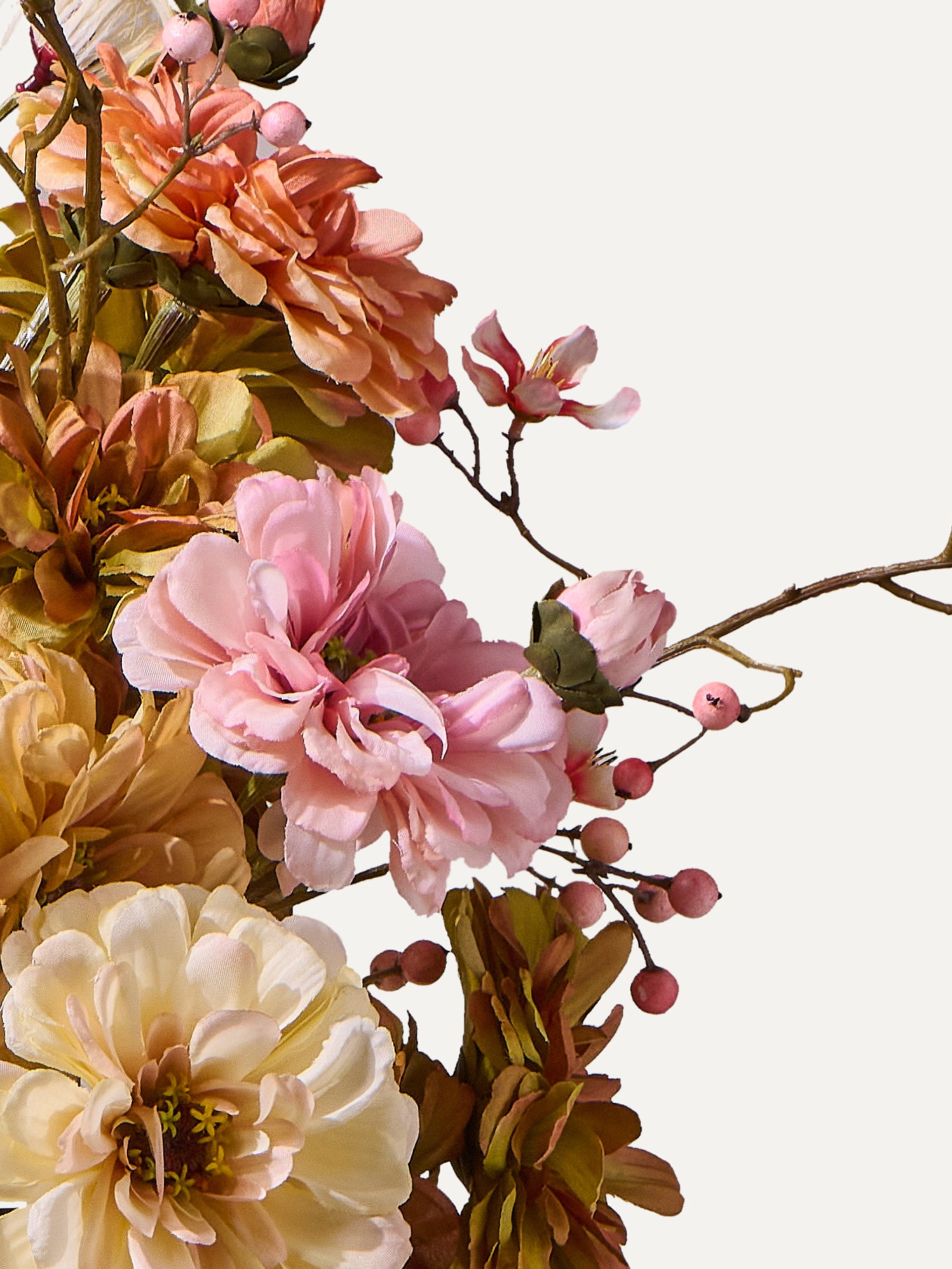 Ein fein abgestimmtes Kunstblumen Bouquet in Rosa, Creme und sanften Brauntönen. Es steht für stille Eleganz und verleiht dem Wohnraum eine warme, edle Präsenz. Besonders neben dem Sofa entfaltet es seine harmonische Wirkung und schenkt dem Raum Tiefe mit subtiler Ausstrahlung.