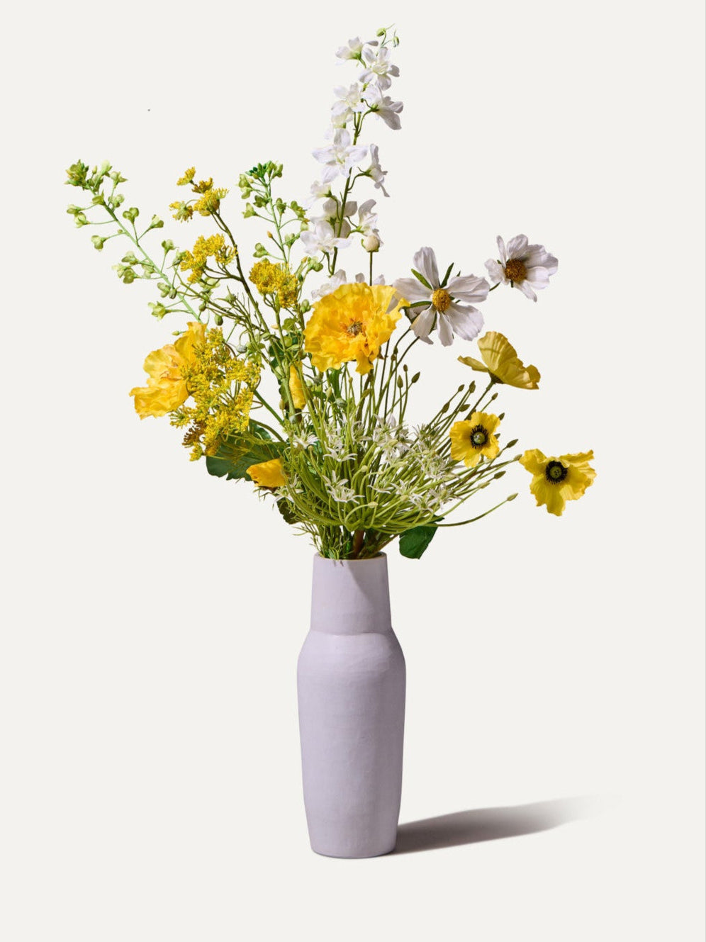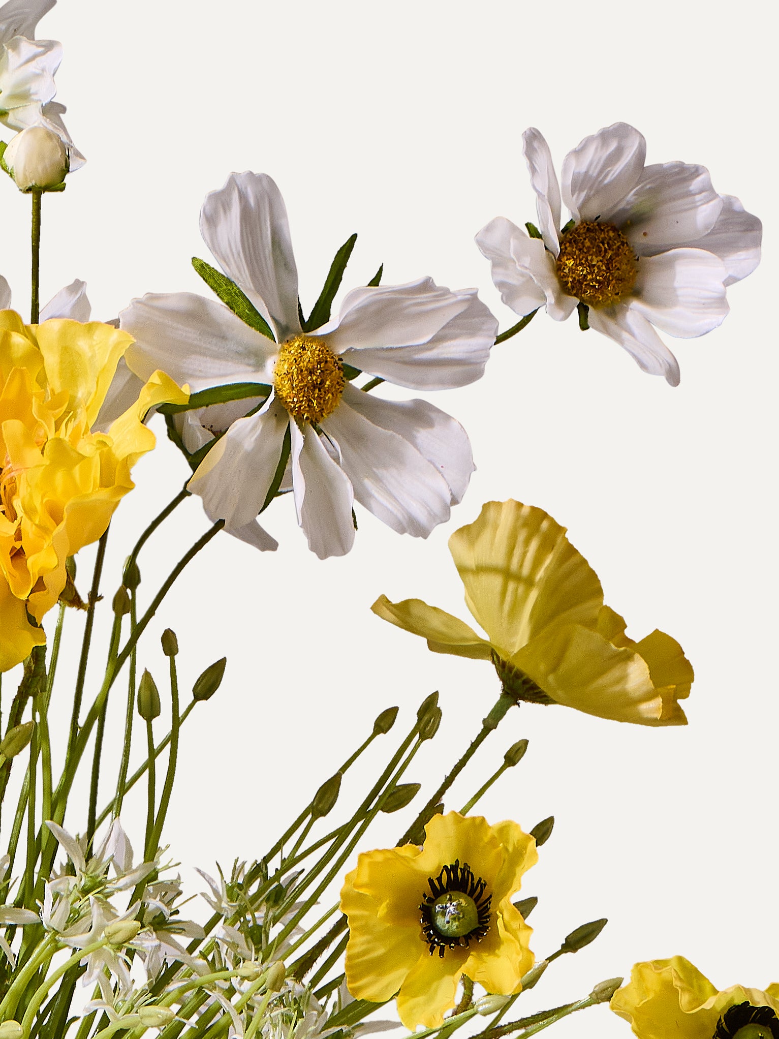 Frisch wie der Sommer und doch das ganze Jahr über zeitlos. In heiterem Gelb und Weiss, mit Mohnblumen, Dille, Gänseblümchen und Allium, schenkt dieses Kunstblumen Bouquet Leichtigkeit und Helligkeit. Ideal für Esstisch oder Küche, wo seine strahlende Ausstrahlung pure Freude verbreitet.