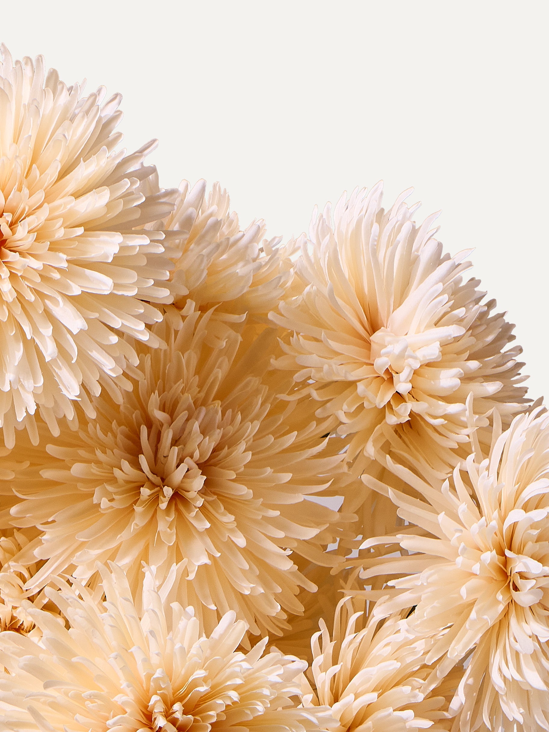 Schlichte Eleganz in ihrer reinsten Form. Ein bleibender Blickfang aus cremefarbenen Chrysanthemen, voll von Volumen und stiller Präsenz. Flauschig und zugleich leuchtend schenkt dieses Kunstblumen Bouquet ein Gefühl von Ruhe, ganz gleich, wo es seinen Platz findet.