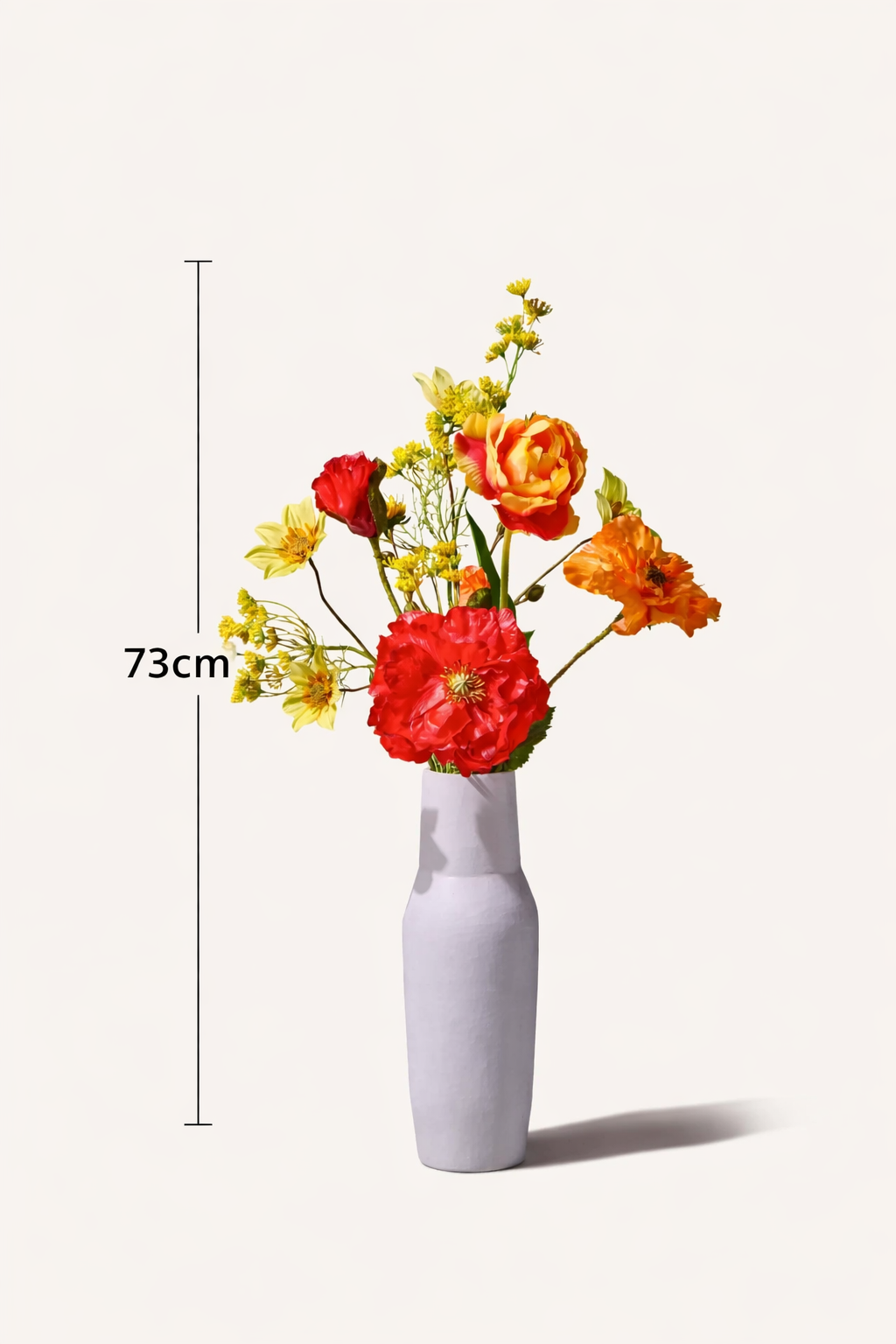 Kompakt in der Grösse und dennoch eindrucksvoll. Mit kräftigen Mohnblumen, goldenen Dahlien und charaktervollen Tulpen entfaltet The Flame, Höhe 73 cm, eine warme Ausstrahlung mit lebendigem Charme. Es eignet sich perfekt fürs Sideboard und setzt einen markanten Akzent, der jedem Raum Tiefe verleiht.