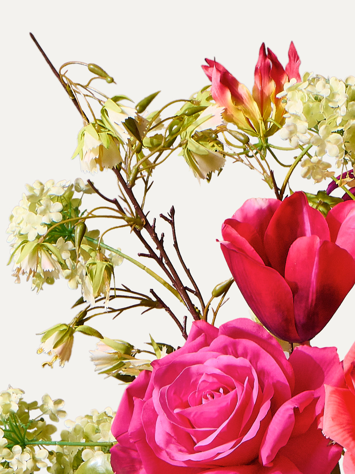 Ein ausdrucksstarkes Kunstblumen Bouquet in feurigem Rot und lebendigem Pink. Handgebunden mit prachtvollen Rosen, markante Flamingoblume und leuchtendem Sonnenhut entsteht eine Komposition voller Energie und Präsenz. Ideal für den Esstisch, wenn aus einem Dinner ein besonderer Moment wird.