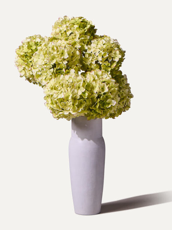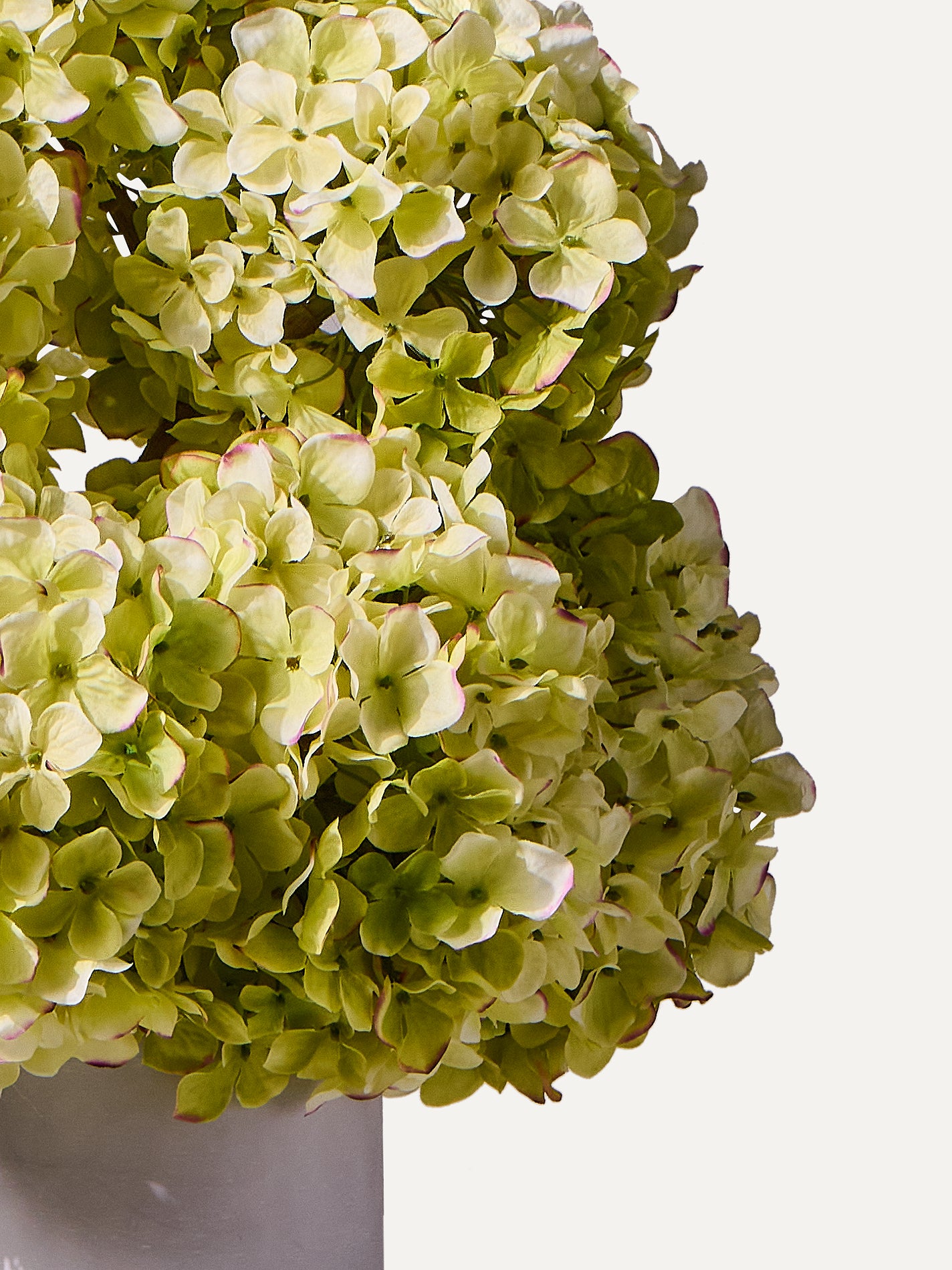 Ein ruhiges Kunstblumen Bouquet in zarten Grüntönen. Sanftgrüne Hortensien fesseln das Auge mit stiller Schönheit und schaffen ein zeitloses Statement, das stilvoll durch alle Jahreszeiten begleitet. Ideal für Sideboard oder Eingangsbereich, wo es Tag für Tag mit leiser Präsenz begrüsst.