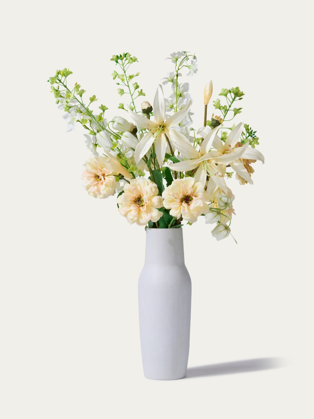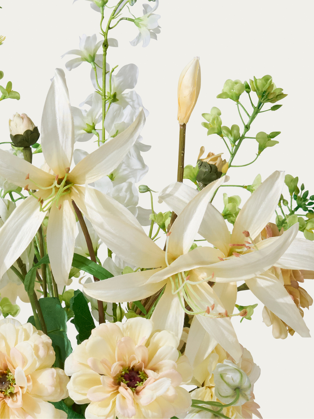 Zeitlose Eleganz in Weiss. Dieses Kunstblumen-Bouquet strahlt Ruhe, Reinheit und Stil aus. Mit seinen sanften, hellen Tönen bringt es Leichtigkeit in jeden Raum. Ein evergreen Bouquet mit Lilien, Zinnien und Rittersporn.