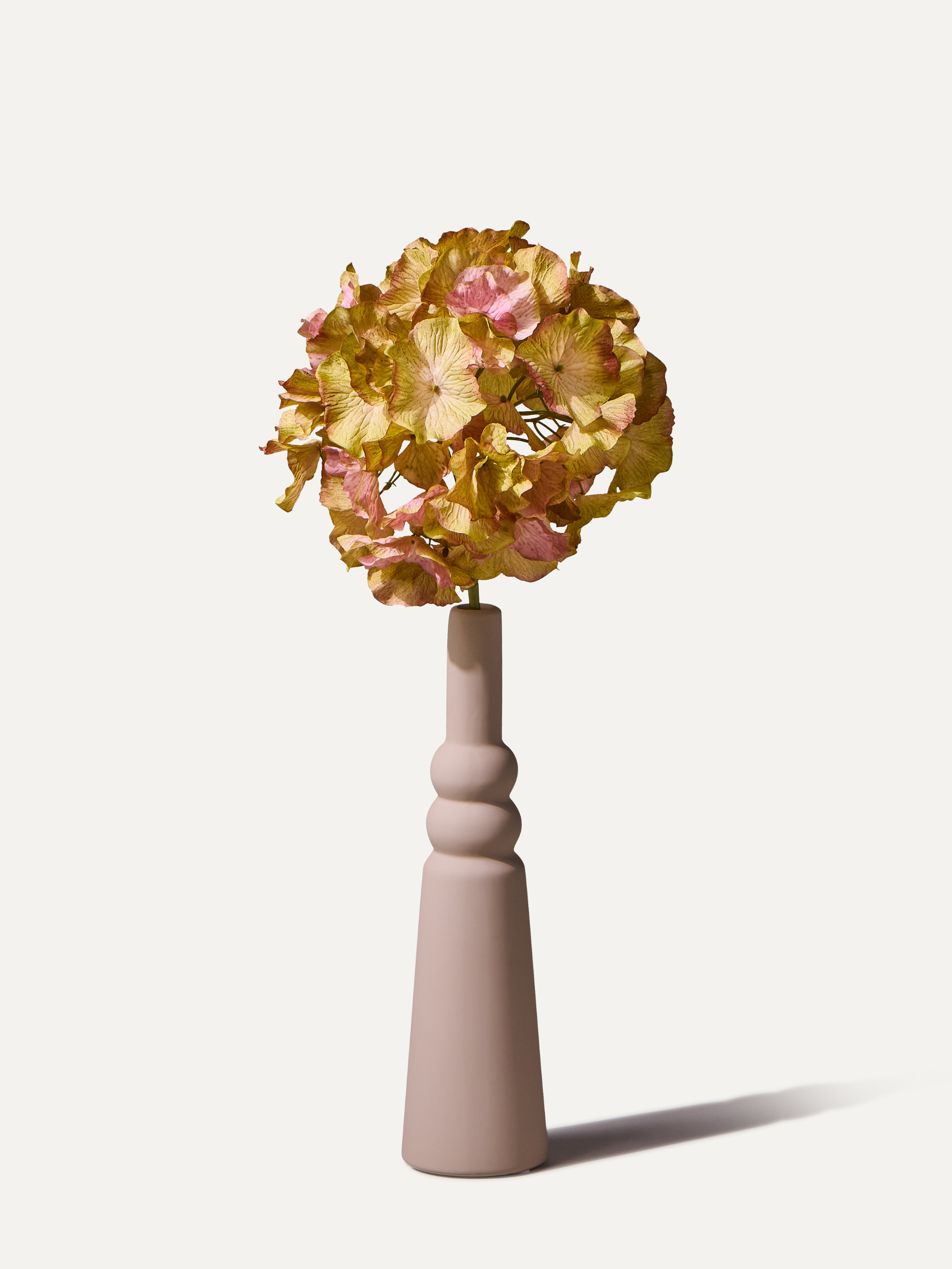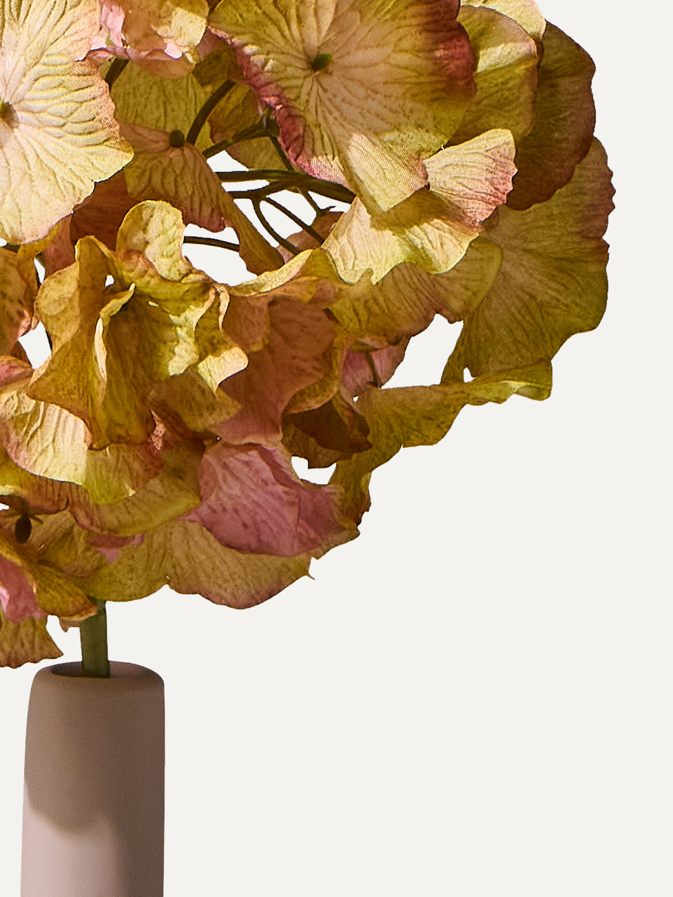 Dieses Design besteht aus einer einzelnen Hortensie, ein Kunstblumenstiel in Silk-ka Qualität, in zartem Mauve inklusive Vase. Dieses Solo verleiht deinem Zuhause Fülle, Eleganz und einen Hauch von Romantik, ein stilvoller Akzent mit bleibender Wirkung.
