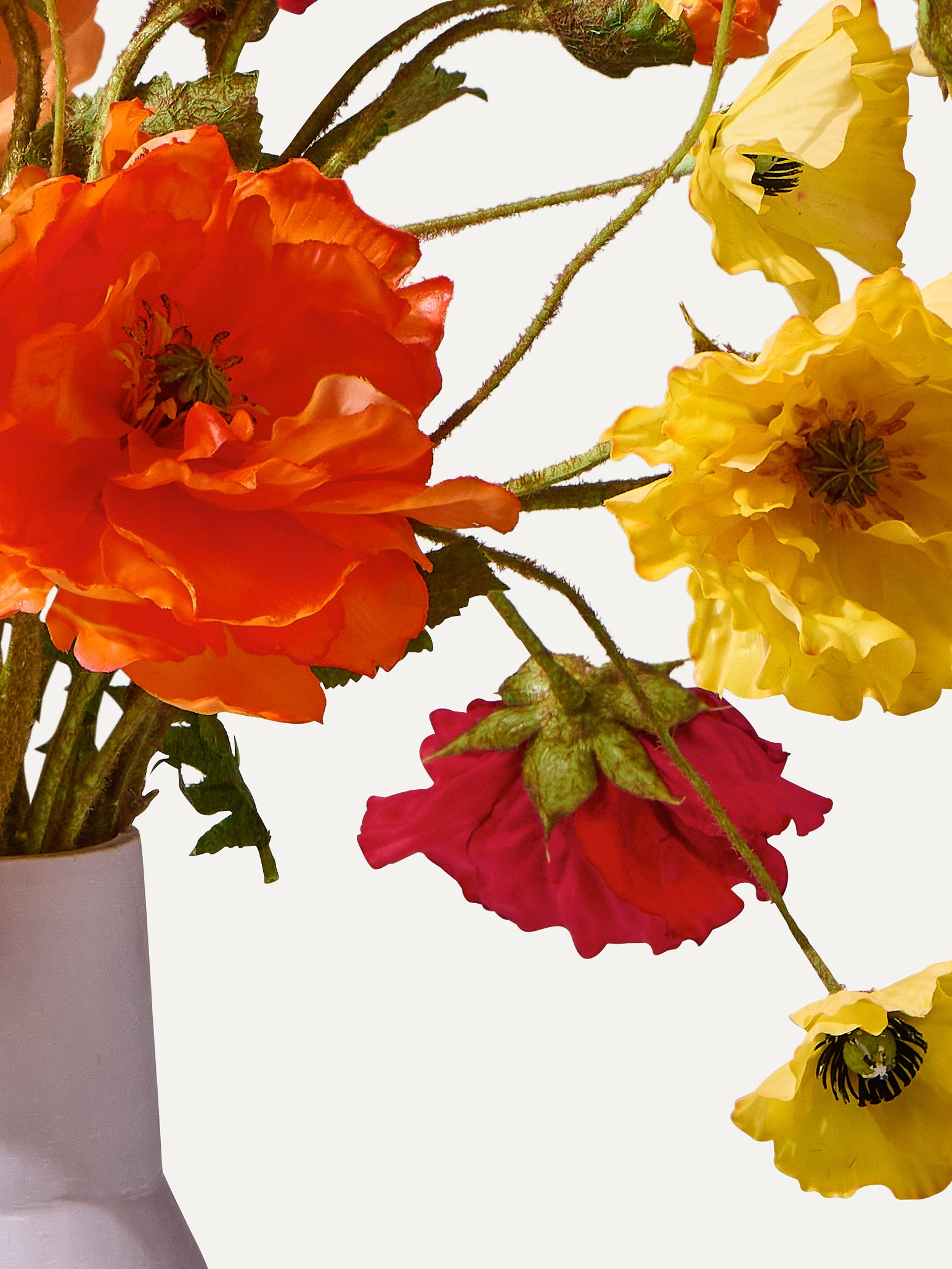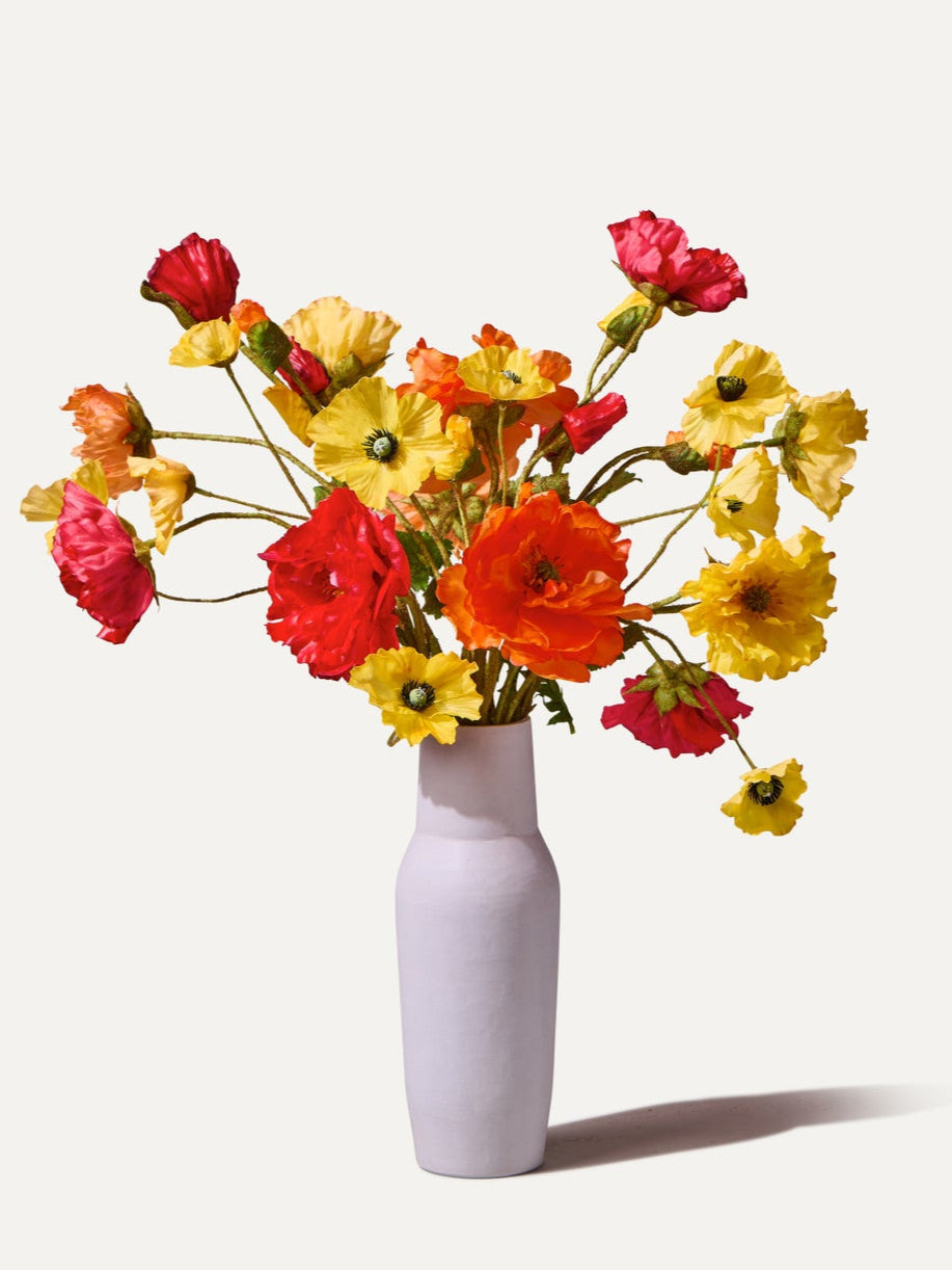Würzig, feurig und mutig. Dieses Kunstblumen Bouquet aus grossen Mohnblumen in Real-Touch-Qualität strahlt pure Energie aus. Ein farbenfroher Blickfang für Esstisch oder Beistelltisch, der Freude und Präsenz ins Zuhause bringt.