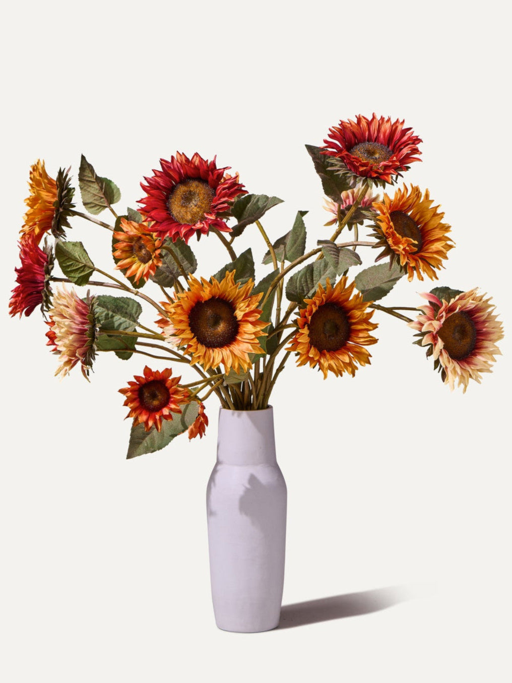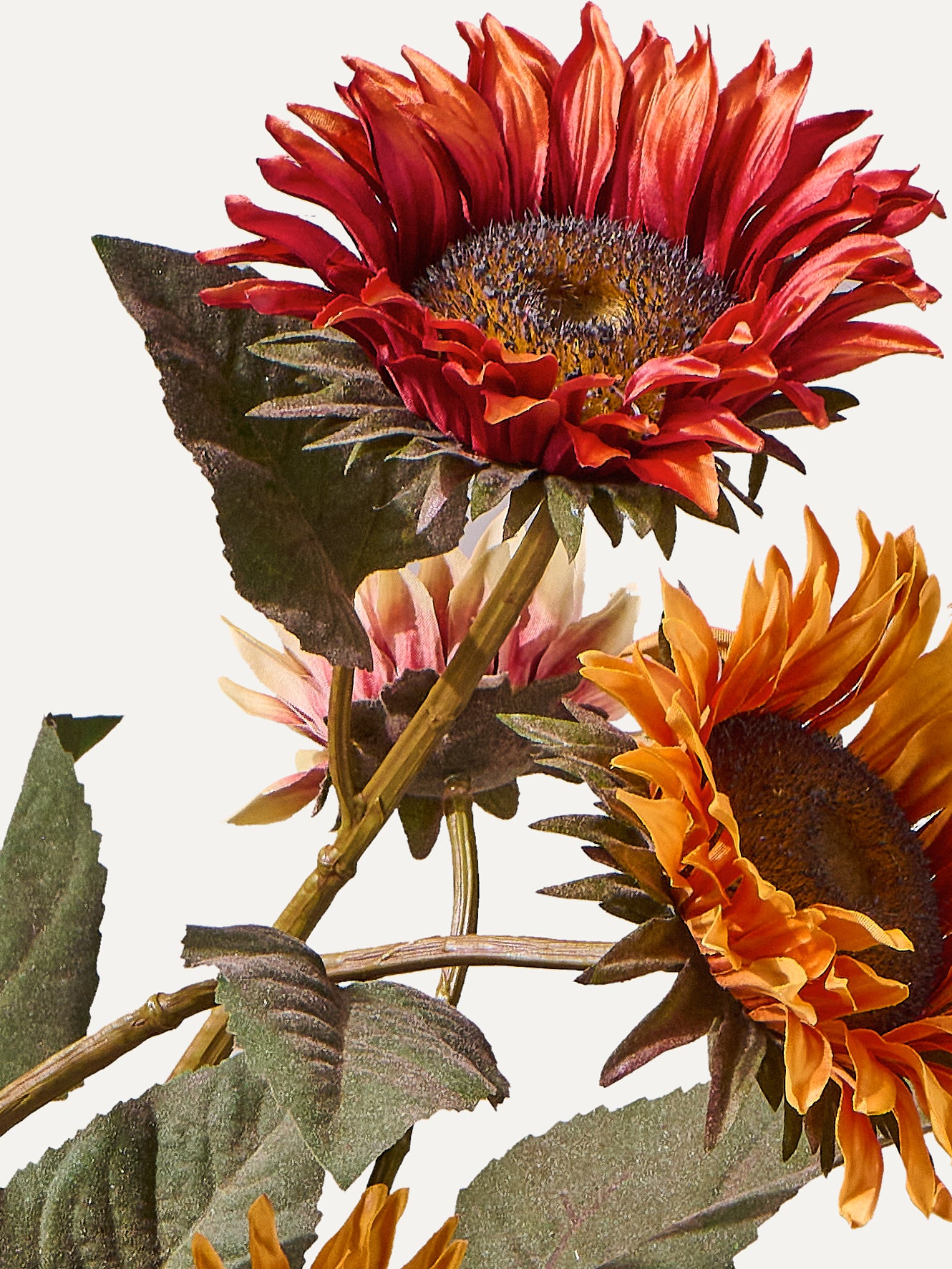 Tiefe, gedeckte Erdtöne verleihen diesen Sonnenblumen eine stille Eleganz. Dieses Kunstblumen Bouquet entfaltet eine geschmackvolle Präsenz, die dem Wohnzimmer Wärme und Stil schenkt.