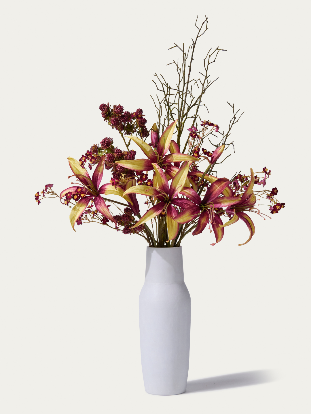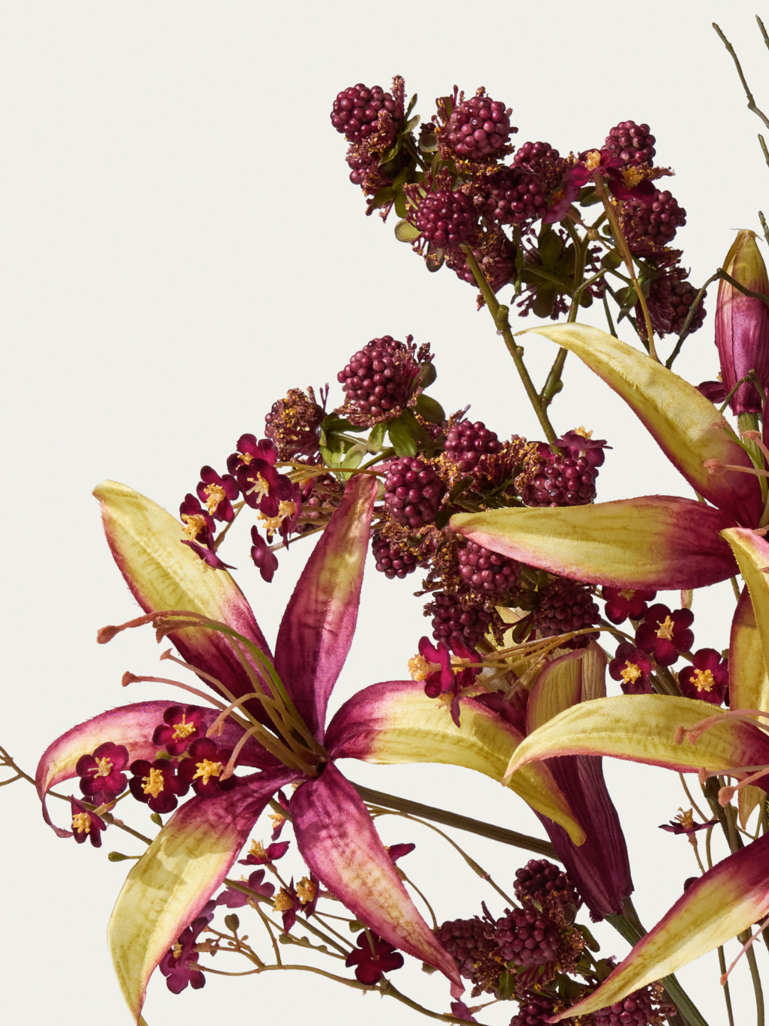 Sinnlich, tief und elegant. Mit satten Violett- und Beerentönen verleiht dieses Kunstblumen-Bouquet jedem Raum Wärme und Raffinesse. Ein Hauch von Luxus, der nie verblüht. Ein Kunstblumen Bouquet mit Lilien und Vergissmeinnicht.