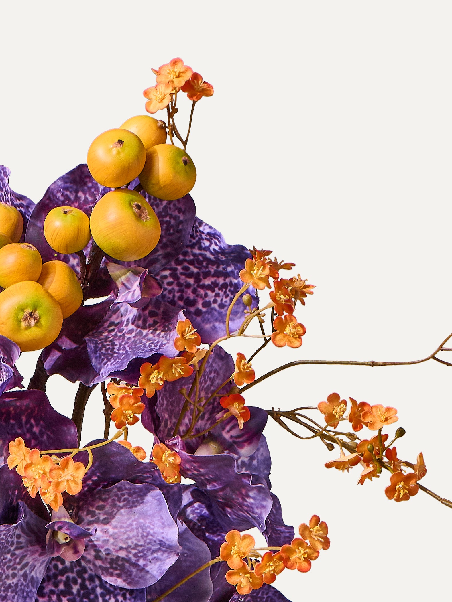 Kunst in der Vase. Mit kräftiger Vanda, luftigen Apfelzweigen und zartem Vergissmeinnicht entsteht ein modernes Kunstblumen Bouquet voller Charme und Charakter. Zeitgemäss und stilbewusst, ideal für kleinere Tische oder das Sideboard, wo es dem Raum sofort Ausdruck und Präsenz verleiht.